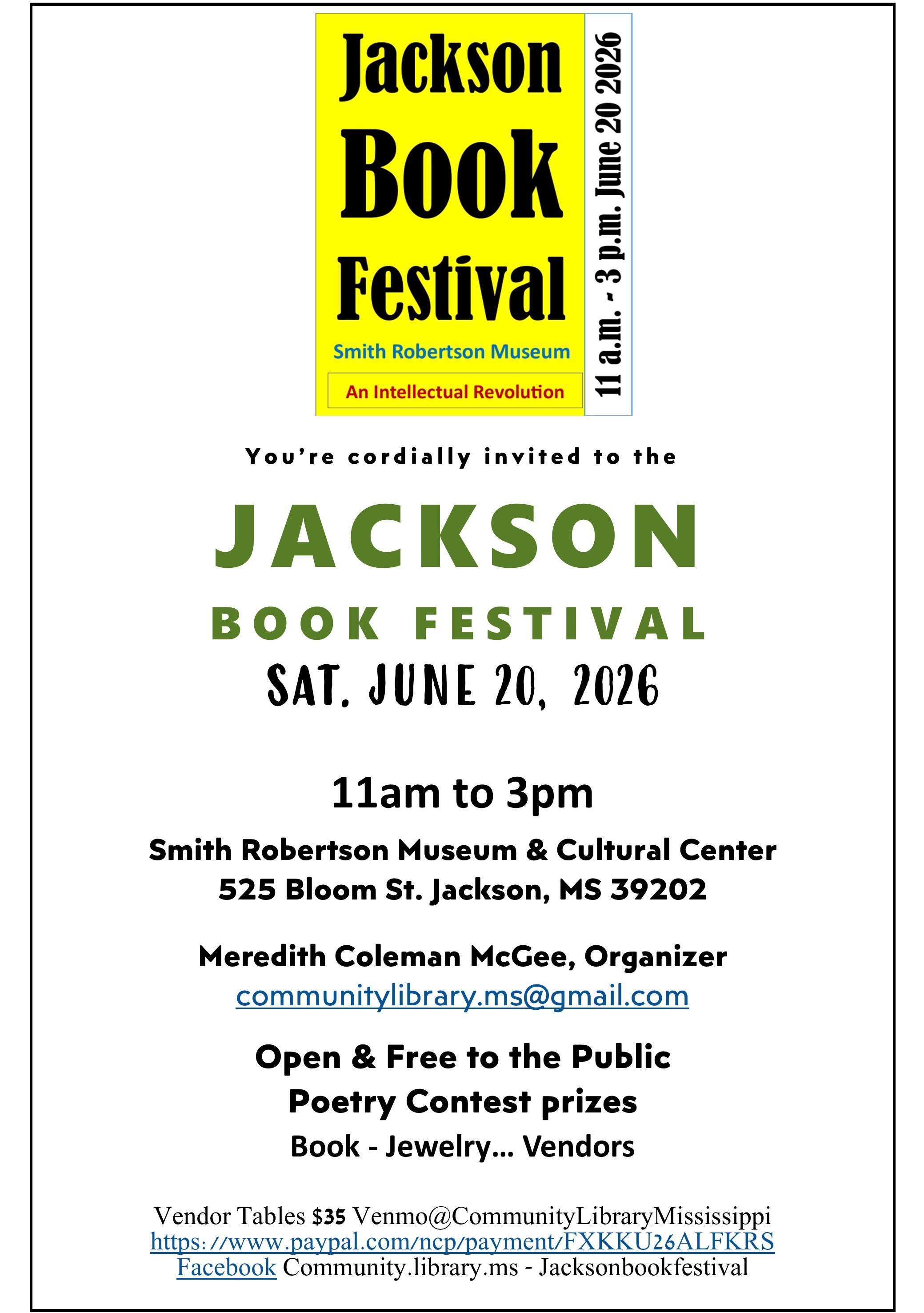 Jackson Book Festival 2026. Jackson, MS 06.20.2026 28 Mar 2026Shop Heirs https://www.eventbrite.com/e/jackson-book-festival-2026-tickets-198613965617 Jackson Book Festival 2026 tickets Share this: Share on X (Opens in new window) X Share on Facebook (Opens in new window) Facebook More Print (Opens in new window) Print Share on LinkedIn (Opens in new window) LinkedIn Email a link to a friend (Opens in new window) Email Like Loading... Related